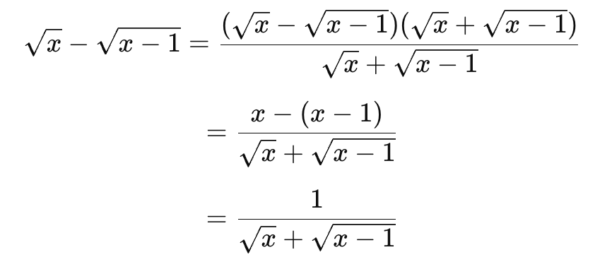 This expression is very helpful because the denominator √x + √(x – 1) is an increasing term with respect to x, that is to say, when x increases, so does the denominator.