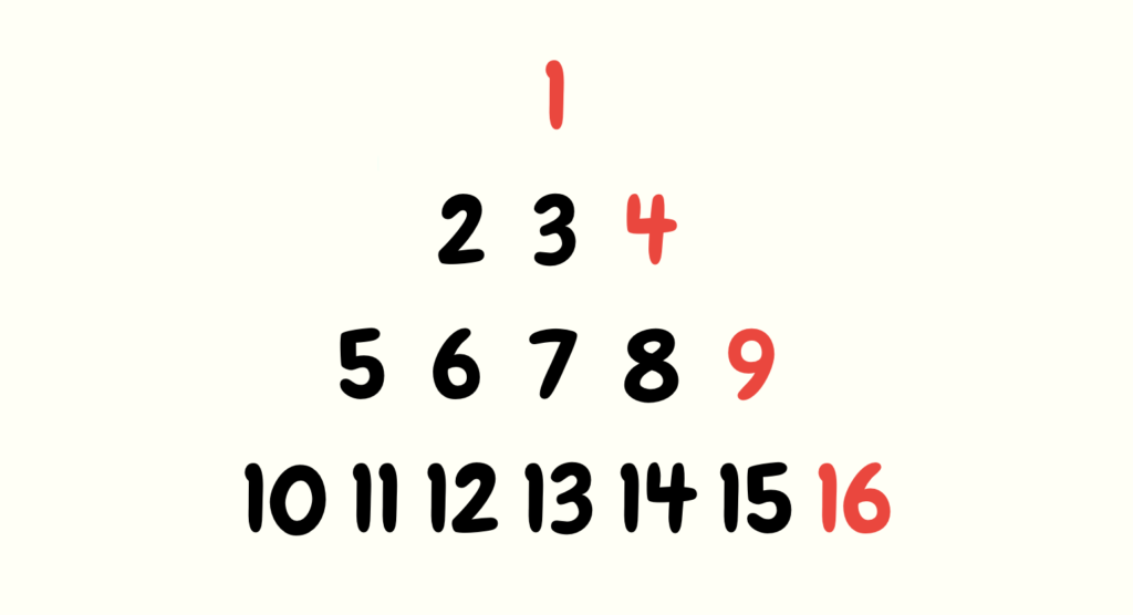 1 is 1^2. 4 is 2^2. 9 is 3^2. 16 is 4^2.
