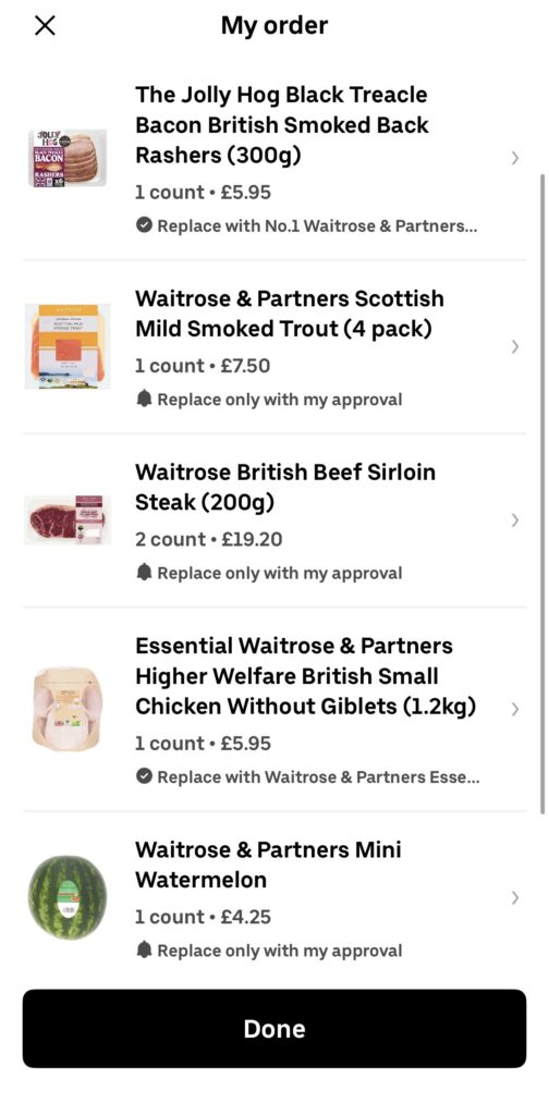 - I got 1 bacon, 1 trout, 1 chicken, 1 watermelon and 2 steaks, which only cost me £22.03 on Uber Eats.