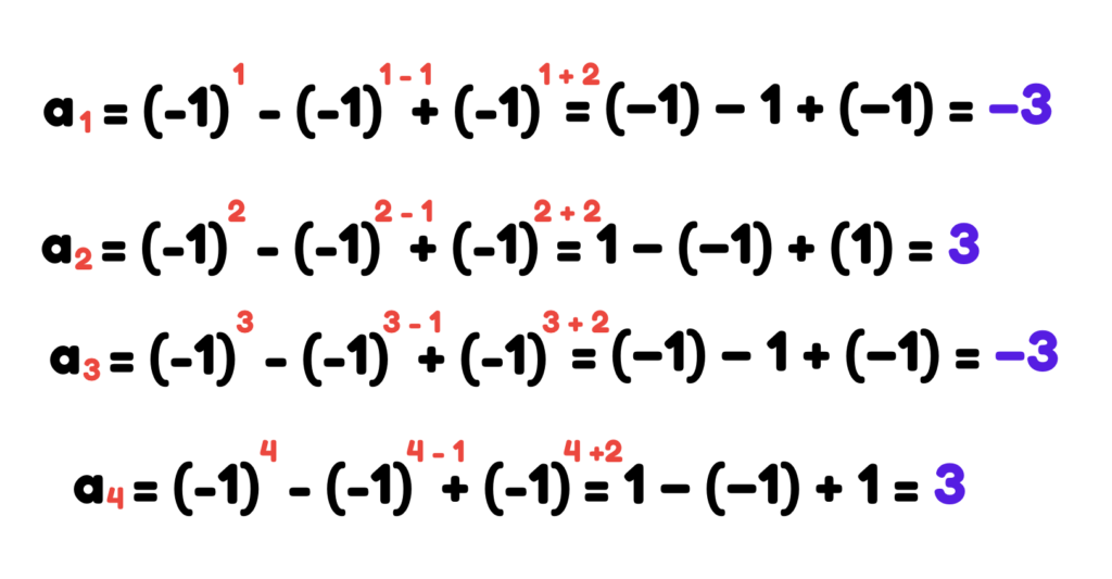 The sequence goes like -3, 3, -3, 3, -3, 3, and so on.