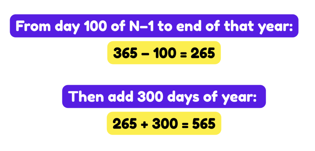 Let’s find how many days separate the 100th day of year N − 1 and the 300th day of the year N, which we know to be a Tuesday.
